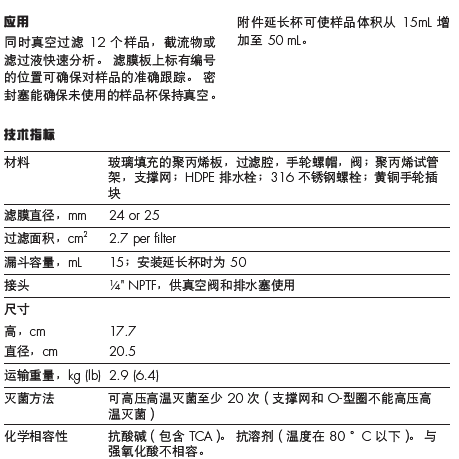 同时真空过滤 12 个样品,截流物或滤过液快速分析。 滤膜板上标有编号的位置可确保对样品的准确跟踪。 密封塞能确保未使用的样品杯保持真空。 附件延长杯可使样品体积从 15mL 增加至 50mL。