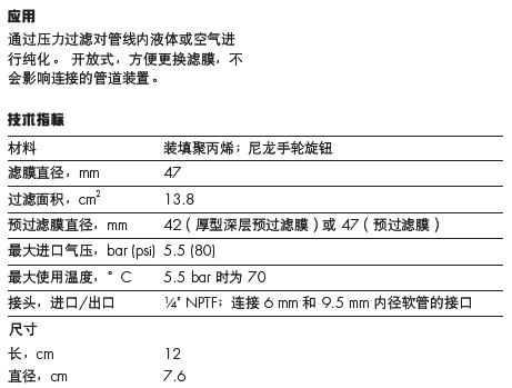 通过压力过滤对管线内液体或空气进行纯化。 开放式,方便更换滤膜,不会影响连接的管道装置。