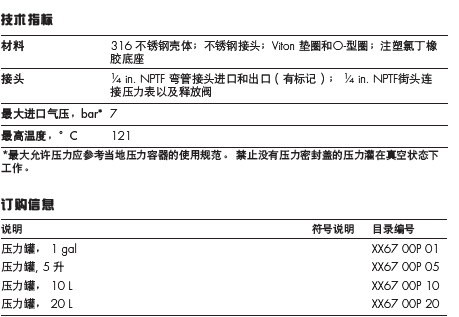如果将压力罐与一个外部的压力源连接,压力罐中盛有的液体便可通过 Millipore 加压过滤器而得到过滤。 罐符合 ASME-UM 规范要求。 密封盖用凸轮锁定手柄密封。 排气后可高温高压灭菌。 附件压力释放阀、压力表和软管接头符合法规规定。 附件密封盖可保证压力罐在真空环境下使用